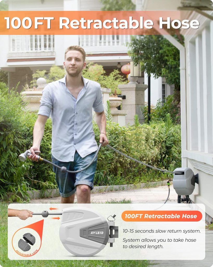 - 【Free Lock】When you pull the hose to the length you need, it will automatically lock the position to stop the hose from retracting, and there is no extra length to bring kinks and tangles, so it is more convenient to use water.