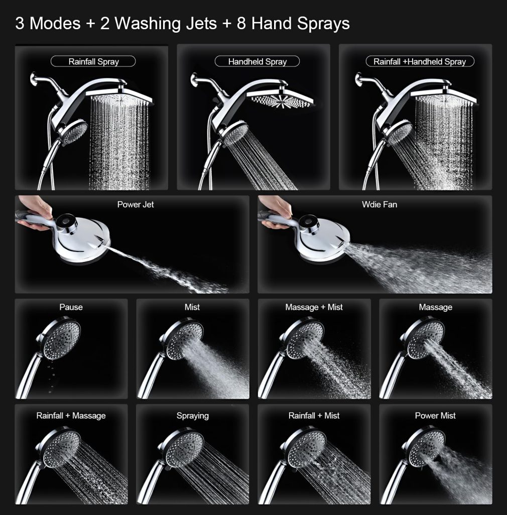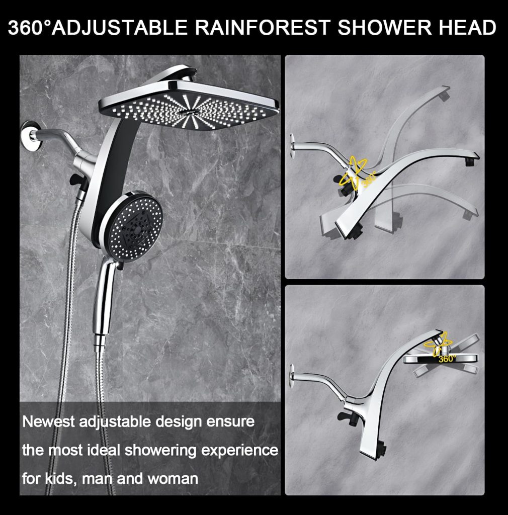 - Larger coverage shower heads with handheld spray combo, our large 12 inch square shower head allows for full body water coverage. Equipped with 10 spray settings hand held shower head, you can enjoy cozy showering, extra 2 different mode power jets can clean your pets or wash your bathroom and bath easily