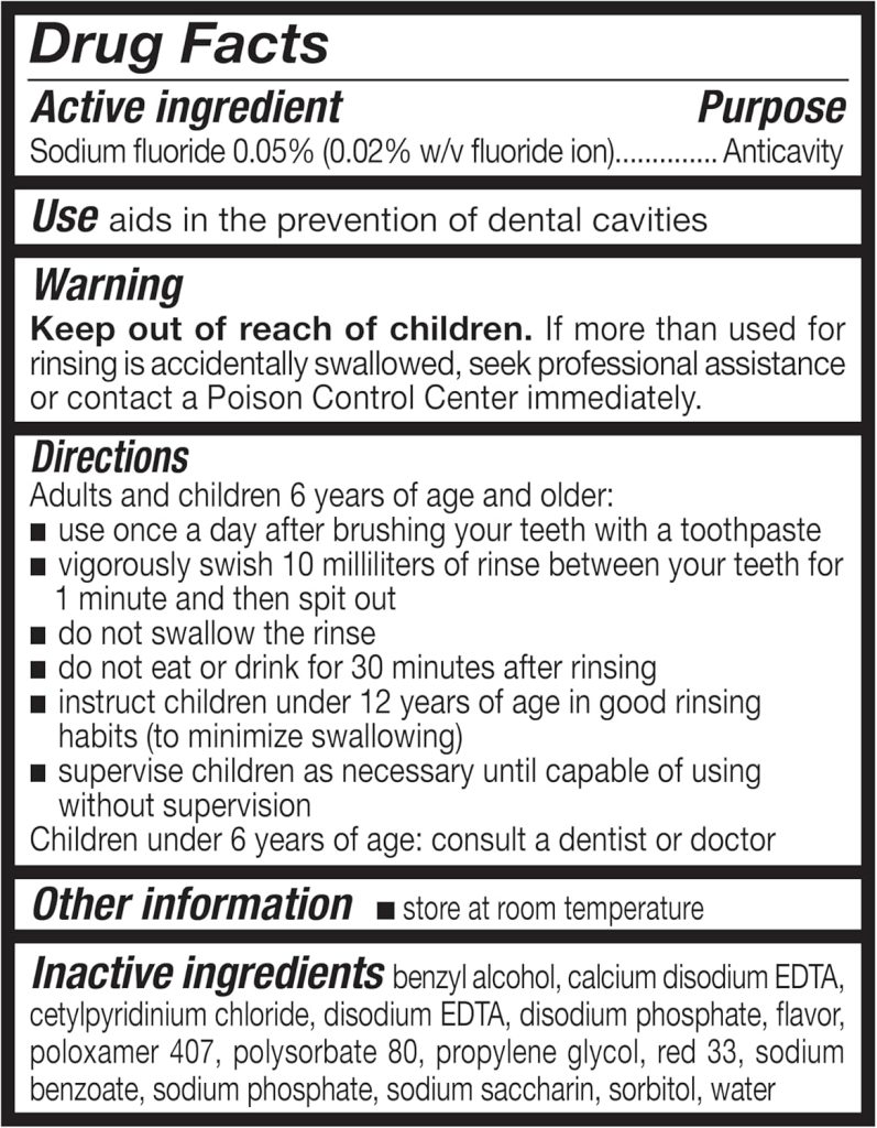 active ingredient: sodium fluoride 0.05% 0.02% w/v fluoride ion; inactive benzyl alcohol, calcium disodium edta, cetylpyridinium chloride, disodium edta, disodium phosphate, flavor, poloxamer 407, polysorbate 80, propylene glycol, red 33, sodium benzoate, sodium phosphate, sodium saccharin, sorbitol, water
