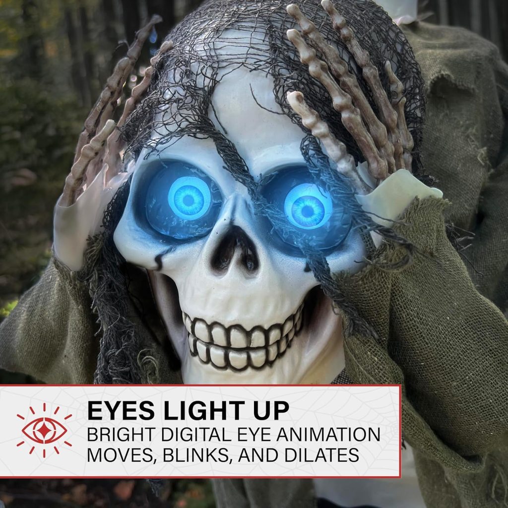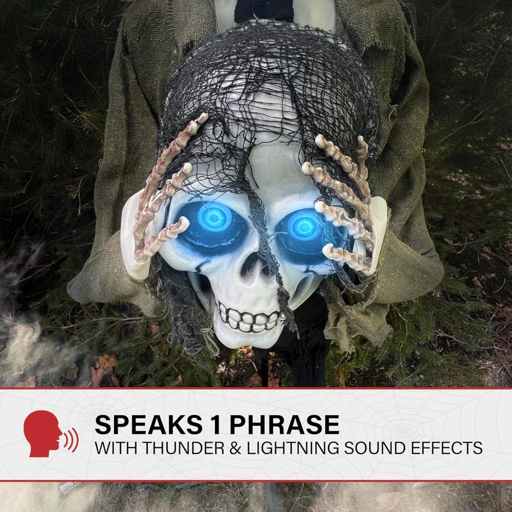 • Makes Noise: Skeleton speaks 1 creepy phrase while thunder and lightning roar in the background to startle even your most stoic visitors