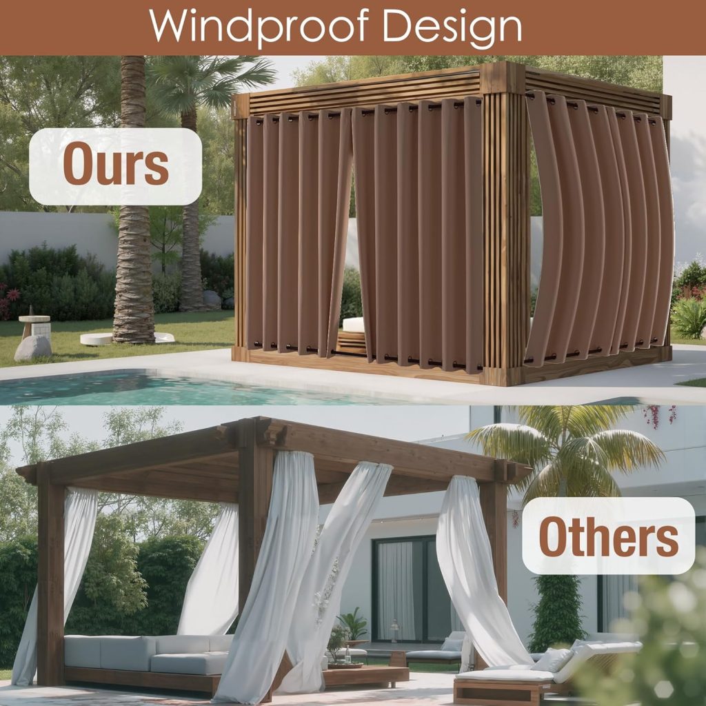 12 people found this helpfulHelpfulReport - Customer5.0 out of 5 stars Perfect!Reviewed in the United States on August 20, 2025Color: MochaSize: 52″W x 72″L (Pack of 2)Verified PurchaseThey really are windproof, waterproof. Heavy curtains. Perfect for my screened in porch!