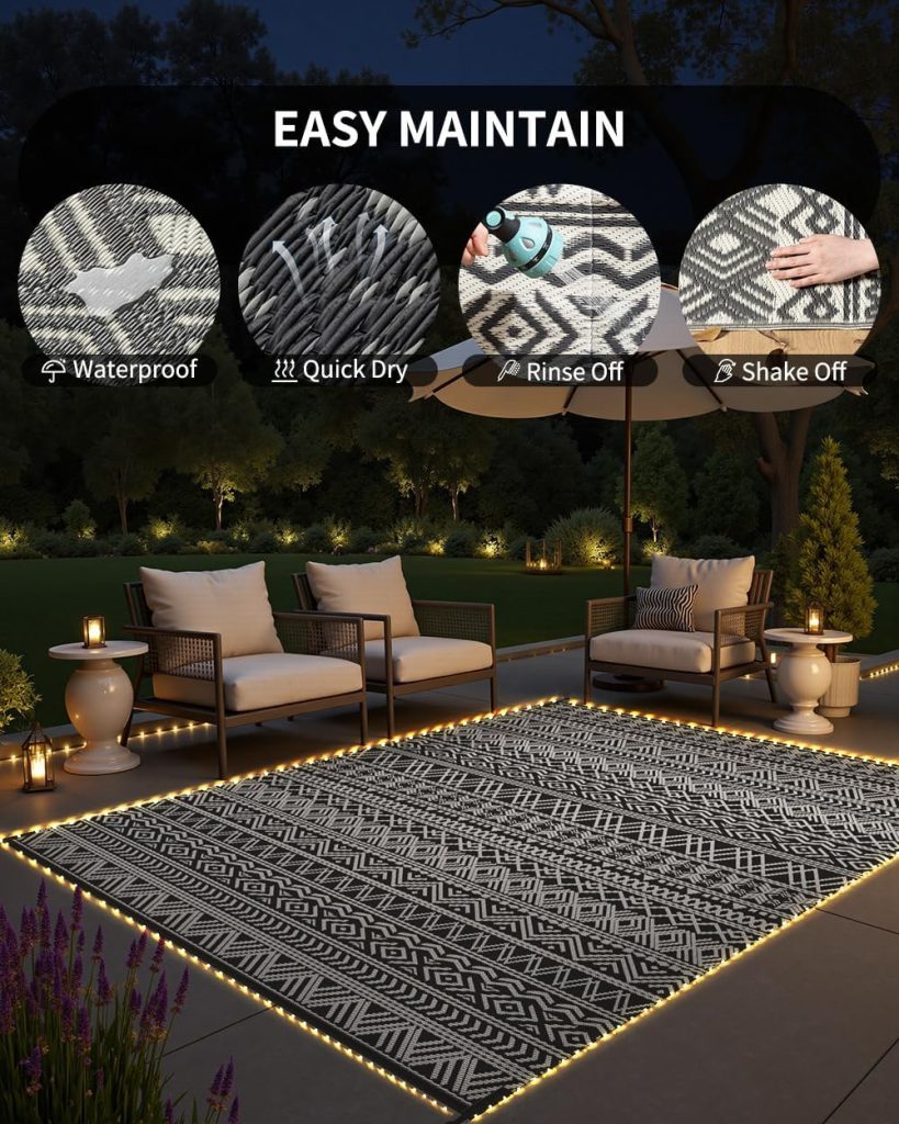- Reversible&Versatile: A budget-friendly two-tone reversible mat is a great outdoor decor for patio and outdoor camping. Modern, versatile and sleek geometric design offers color and personality to your indoor outdoor space. Extra strip lights spruce up the dankness with romance.